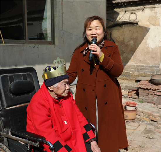 欢乐的农家小院里,公益在线淄博站的志愿者们在会长王文晓的带领下,带着我们真诚的爱心,带着我们深深的祝福,前去为老寿星祝寿。志愿者代表给老寿星敬献了““寿”字,敬献了花馍,集体为老寿星唱起了《生日歌》,恭祝老寿星福如东海长流水,寿比南山不老松。祝福老寿星笑口常开每一天,增福增寿享晚年。