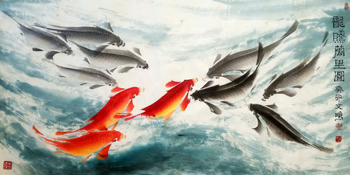 著名易学书画家程文鸣参展作品 程文鸣受到中华传统文化的熏陶,擅长绘画,尤其钟爱画鱼。他认为,一幅优秀的作品不仅在于艺术的表现,更应该承载着历史和思想内涵。正是基于这一信念,他创立了“哲学绘画体系”,将周易的智慧融入到绘画中,让作品更具时代意义。在这次作品展中,程文鸣借助了易学的理念,将中国传统文化元素融入到作品创作中,使每一幅画作都流淌着中华文化的血脉。无论是对鱼的神态、色彩的运用,还是画面的构图、线条的处理,程文鸣都展现出了高超的审美眼光和艺术功力。