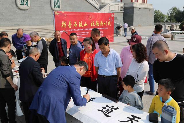 天地无言,石鼓有文。适逢盛世,举国欢庆。 9月30日,在中华人民共和国70周年华诞前夕,由中国老子文化研究院书画院西北分院,北京宣和书画艺术研究院宝鸡分院,宝鸡青铜器博物院联合主办的“挥毫石鼓山 讴歌新时代——庆祝中华人民共和国成立70周年书画联谊会暨王季祝巨幅楹联展示活动,在中国青铜器博物院石鼓广场举行。