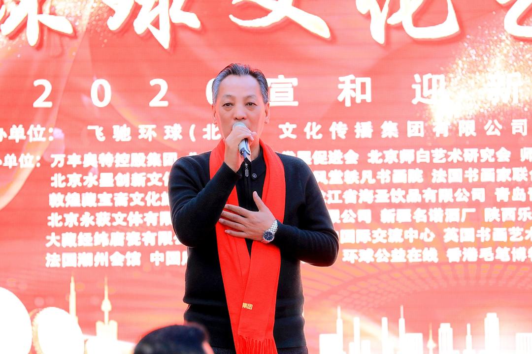 各位领导、嘉宾及参展书画家集体合影留念 2020年1月9日下午,本次展出的是著名画家杨丙臣的国画作品,由飞驰环球(北京)文化传播集团有限公司、北京宣和书画艺术研究院主办;万丰奥特控股集团、北京公益服务发展促进会、师说文化传媒、北京正举沈鹏书画院、北京花城春秋书画院、北京师白艺术研究会、北京水墨创新文化艺术院、北京大千大风堂轶凡书画院、法国书画家联合总会北京分会、北京市草桥南国水乡美食广场有限公司、荣成泰祥食品股份有限公司、鲅鱼水饺,敦煌藏宝斋文化旅游发展有限公司、黑龙江省海圣饮品有限公司、青岛青久坊福慧酒业有限公司、云南中烟工业有限责任公司、北京永荻文体有限公司、怀来云腾商贸有限公司、新疆名诺酒厂、陕西乐丽鑫生物科技有限公司、北京服装企业联盟会、大藏经纬唐瓷有限公司、日本NPO法人日中国际交流中心、英国书画艺术研究院、美国书画艺术研究院、法国书画家联合总会、法国潮州会馆、香港画院、香港毛笔博物馆、中国周易新闻网、公益在线、环球公益在线协办支持的飞驰环球2020环球文化艺术盛会暨宣和迎新春书画联展活动在北京市丰台区世界花卉大观园隆重举行。