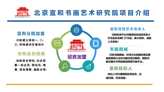 宣和艺术院联手飞驰环球文化传播集团在人民大会堂、全国政协礼堂、中央党校、中国国家博物馆、中国美术馆、炎黄艺术馆、民族文化宫、中国国际展览中心、798艺术区、鸟巢艺术中心、水立方艺术中心、香港、韩国、法国、意大利、瑞士、英国等地组织书画展览、写生采风及文化交流活动等。 宣和艺术院为弘扬传统文化,相应国家号召,目前国家针对传统文化产业的扶持越来越大,本院结合文化政策现状,以互联网+为载体,整合社会人脉资源,实现文化传播、繁荣市场,向国际化发展前进。为扩大宣和书画艺术研究院发展,经院委会研究决定招募会员、研究员、理事、常务理事、副院长等。 ![]()