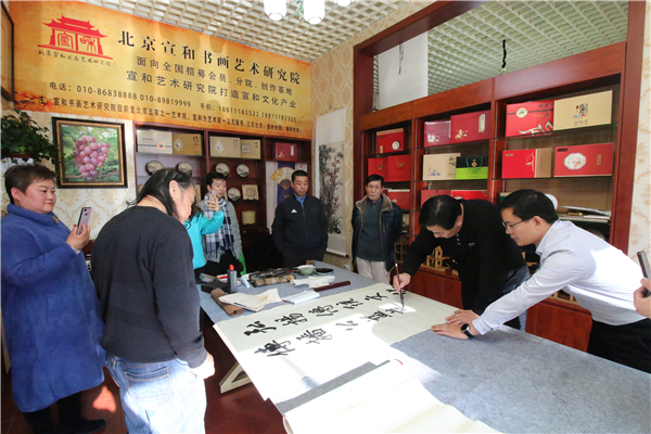 书画家沈鹏(正举)现场挥毫 近年来,宣和艺术院以传播中华传统文化艺术,弘扬华夏文明,展现中华艺术风貌,广交友,深合作,求共赢为宗旨,在国内建立多家分院和写生基地,得到了社会各界的认可和好评,在艺术界树立了良好的口碑,让中华优秀的艺术走向世界,成为联系海内外各界人士的纽带和桥梁, 与时俱进的北京宣和书画艺术研究院正积极探索更为高效的运营机制,并朝着更加专业化、品牌化、国际化的方向前进,努力成为文化事业可持续发展的典范。宣和艺术院打造“宣和”文化品牌,立足北京,面向全国,辐射全球,在探索与发展中向“国际化文化品牌”迈进。