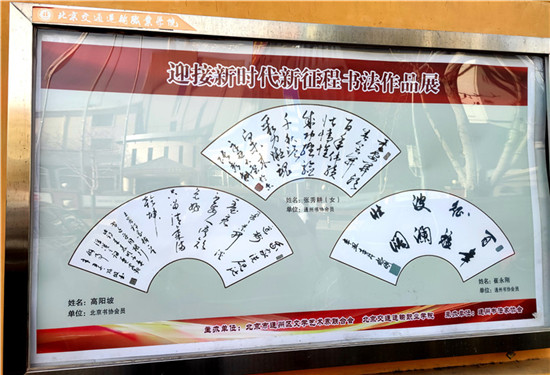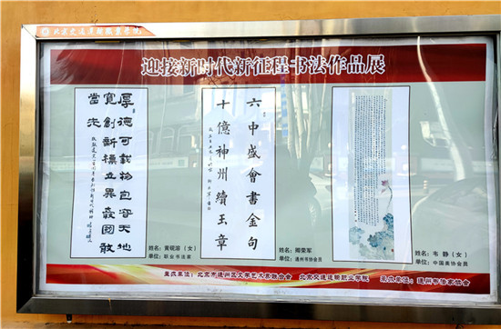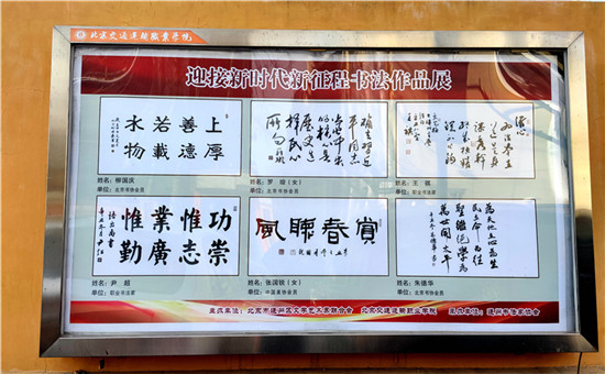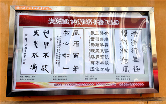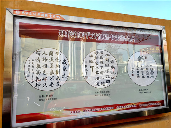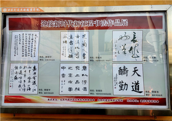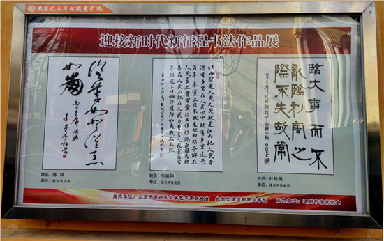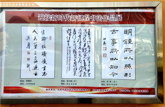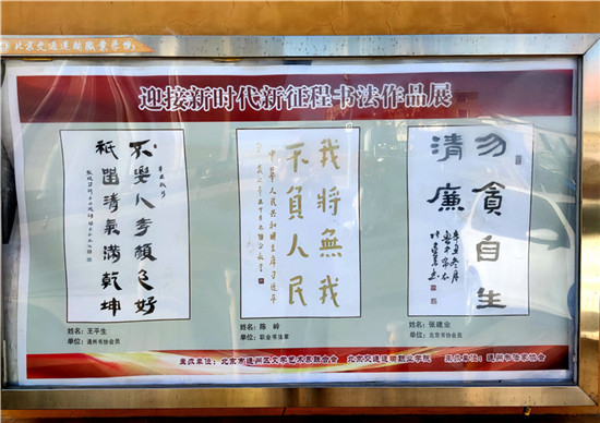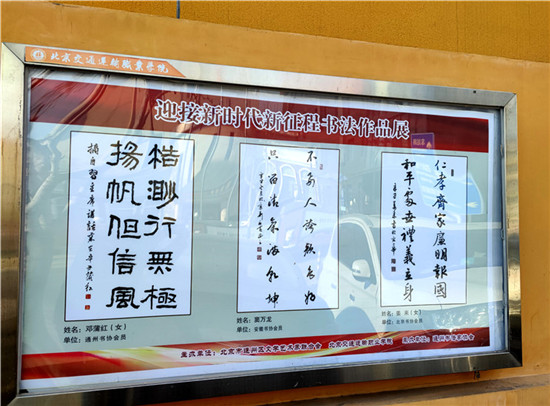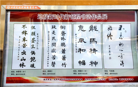 为学习贯彻党的十九届六中全会精神,落实通州区第七次党代会精神,迎接党的二十大召开,在两节到来之际,由北京市通州区文学艺术界联合会、北京交通运输职业学院主办,通州书法家协会承办的“迎接新时代新征程书法作品展”在车站路橱窗面世。这次共推出54位作者的54幅作品,所有作品均系各位书法家近期创作,书写内容紧跟新时代新征程,既有反映廉政建设、弘扬运河文化等,又有彰显副中心建设步伐等方面内容,书写形式也琳琅满目,为新的一年到来增添了浓郁的年味。