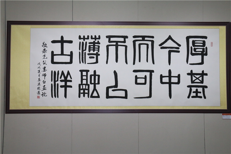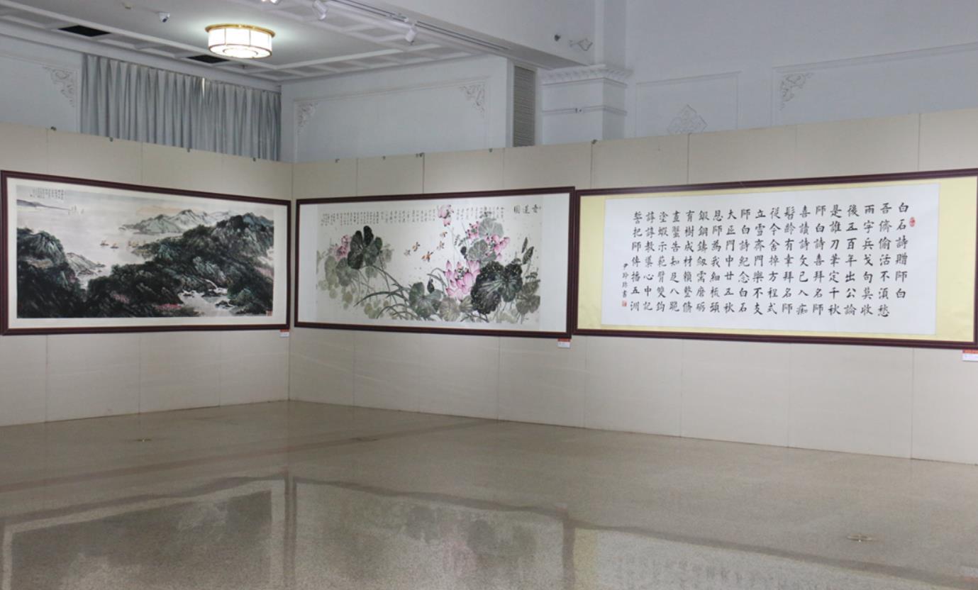 在阳光的照耀下,格外醒目。走进大厅,红底黄字背景版上赫然题写着《师白百年·德艺双馨——纪念国画大师娄师白诞辰一百周年书画展》,如同一面熠熠生辉的巨幅画墙屹立在主展厅前,壮观雄伟,气势恢宏。