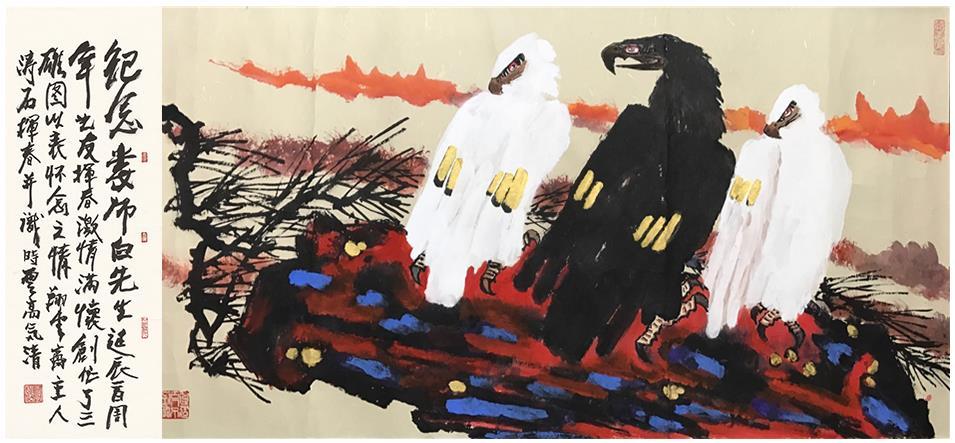 16、王挥春 艺术大师刘海粟弟子,北京画院国家一级美术师、原湖社画会会长、北京师白艺术研究会艺术顾问 绘画:三鹰图。纪念娄师白先生诞辰一百周年,艺友挥春激情满怀创作了三雄图,以表怀念之情。