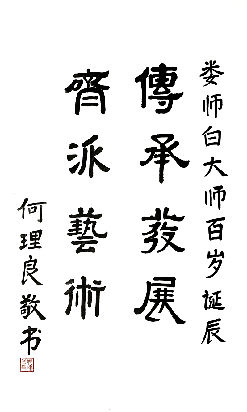 3、何理良 原全国人大副委员长,国务院副总理兼外交部部长黄华夫人 书法:传承发展齐派艺术。
