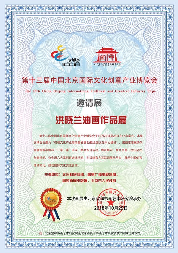 宣和网讯(记者 张鸾敏、袁秀伟 ):由文化和旅游部、国家广播电视总局、国家新闻出版署和北京市人民政府共同主办的第十三届中国北京国际文化创意产业博览会于10月25日至28日在中国国际展览中心举办。“宣和·至臻”书画名家邀请展系列活动,是由北京宣和书画艺术研究院承办,飞驰环球文化传播全程报道,本次展出的是著名油画家洪晓兰油画作品。出席本次画展的嘉宾有:北京宣和书画艺术研究院名誉院长、外交部原驻卢森堡大使马志学,北京宣和书画艺术研究院名誉院长、北京师白艺术研究会会长、国画大师娄师白长子娄述德,宣和艺术院顾问、原中央军委战略规划室原副主任马建国少将,宣和艺术院顾问、《西游记》沙僧的扮演者、著名表演艺术家刘大刚,张大千长孙女张子嘉,宣和艺术院执行院长单玉志、常务副院长许顺喜,秘书长杨东亮等嘉宾及媒体到场祝贺。
