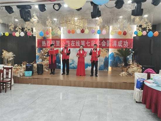 (编辑:冯永军)2026年元月5日上午11时,公益在线淄博站第七届年会隆重开幕。早上8点,志愿者就来到现场开始布置会场。大家有的整理舞台,有的吹气球挂气球。有的装果盘。10点左右已经把会场布置的即热烈又温馨,既有家的感觉又有过年的味道。